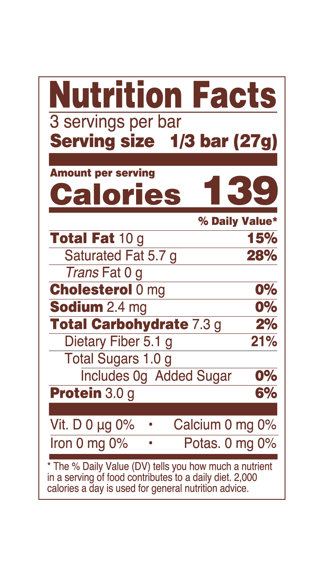 Ingredients: Organic Cocoa Liquor, Organic IMO Tapioca, Organic Cocoa Butter, Organic Cashew Nuts and Organic Brazil Nuts. Gluten Free. Allergens: May Contain Coconut, Pistachios, Almonds, Peanuts and Hazelnuts.